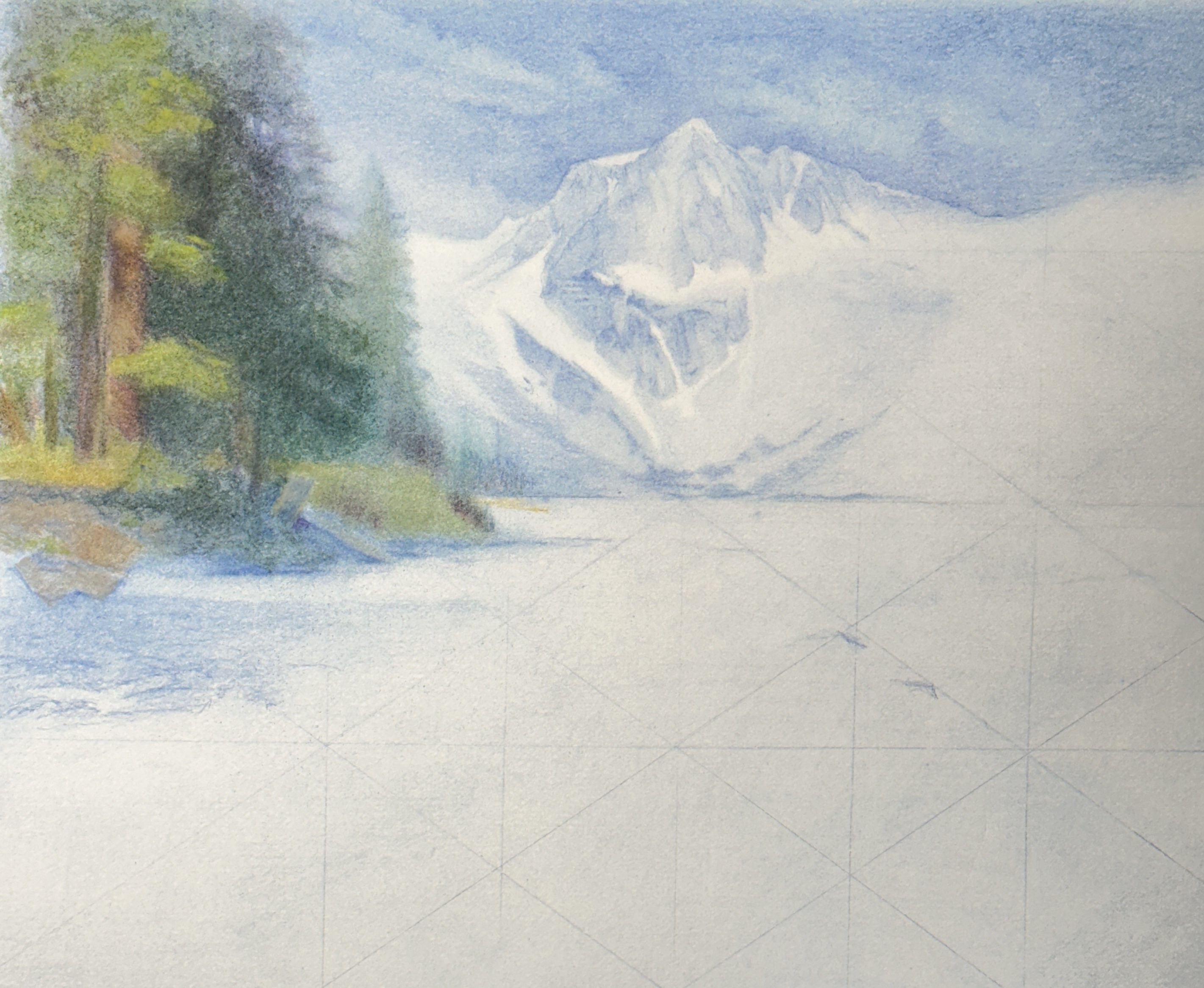 I’m working on a landscape now which is a commission. Instead of sanding charcoal I’m sanding Prussian Blue chalk pastel as the under drawing and adding colors of Chalk pastel over it. It’s rather ambitious and I’m still learning to control the medium but It’s coming together slowly.