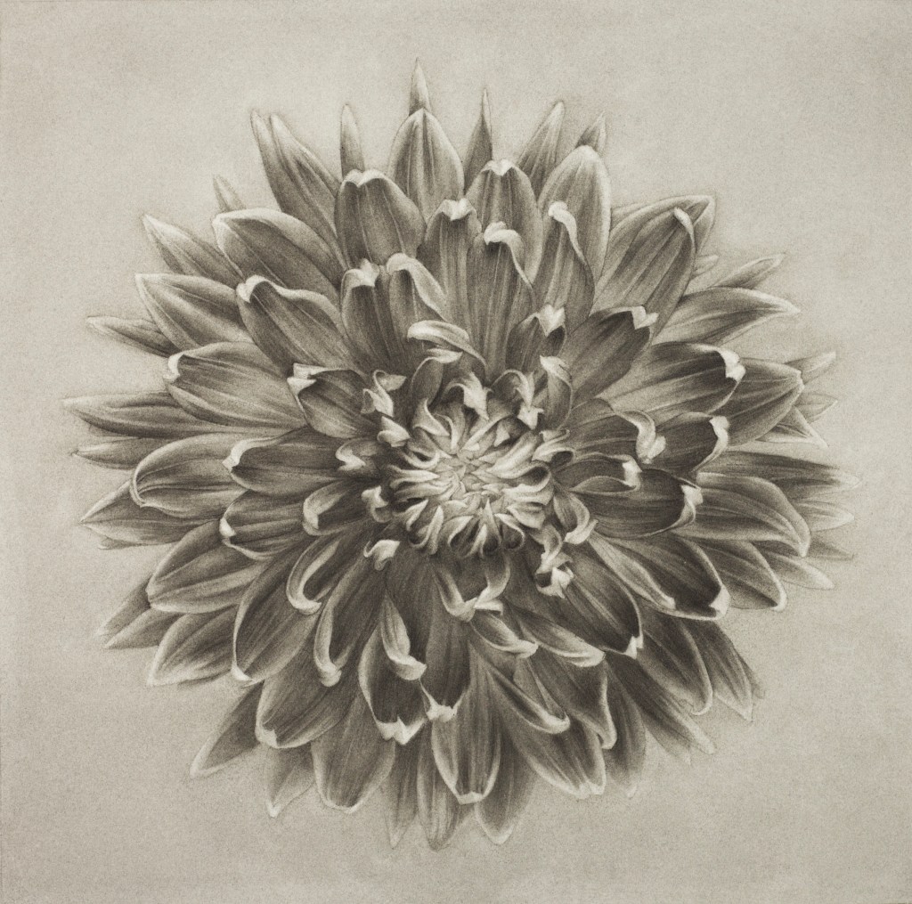 When I think of sculpture I think of clay or marble and how reductive it is. You are carving away at a material and pulling the objects out of the mass through a kind of controlled chaos. The process of sanded charcoal is so similar. Laying down the charcoal material and then using sandpaper to, in a way, carve into it. Slowly reducing, pulling and manipulating the charcoal, I’m continually adding, subtracting, toning and refining the image until the level of detail is satisfactory. It’s like pulling the focal point out of the chaos. The finished piece, “Dahlia’s Rapt Gaze” is 32″ x 32″ and won a Drawing award at the Greenwich Art Society.